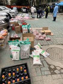从开始在群里通知业主们自己领取,再到后来为减少接触,志愿者们对着各类物资清单逐一确认后,一一搬运到小拖车上,一个单元一个单元分批按门铃通知大家排队有序领取。由于各类物资近百种,总会出现错拿漏拿,我们又改进发放方法,志愿者们各守几类物资阵地,业主们按购物序号间隔领取。然后我每天穿梭于数百种各类生活物资摆出的阵地之间,为每一位业主配送货物,和业主本人一同检查并核对物资清单,场面热闹非凡、忙而有序。这是我们实战中摸索出的高效配送方案,也源于我们志愿者们之间的默契配合,相互搭把手、传个话、一个眼神、一个动作大家心领神会。每一位领取物资的人都会由衷地说一句:感谢你,辛苦啦!这样的工作伙伴这样的工作场景,我只想说累到满心欢喜!